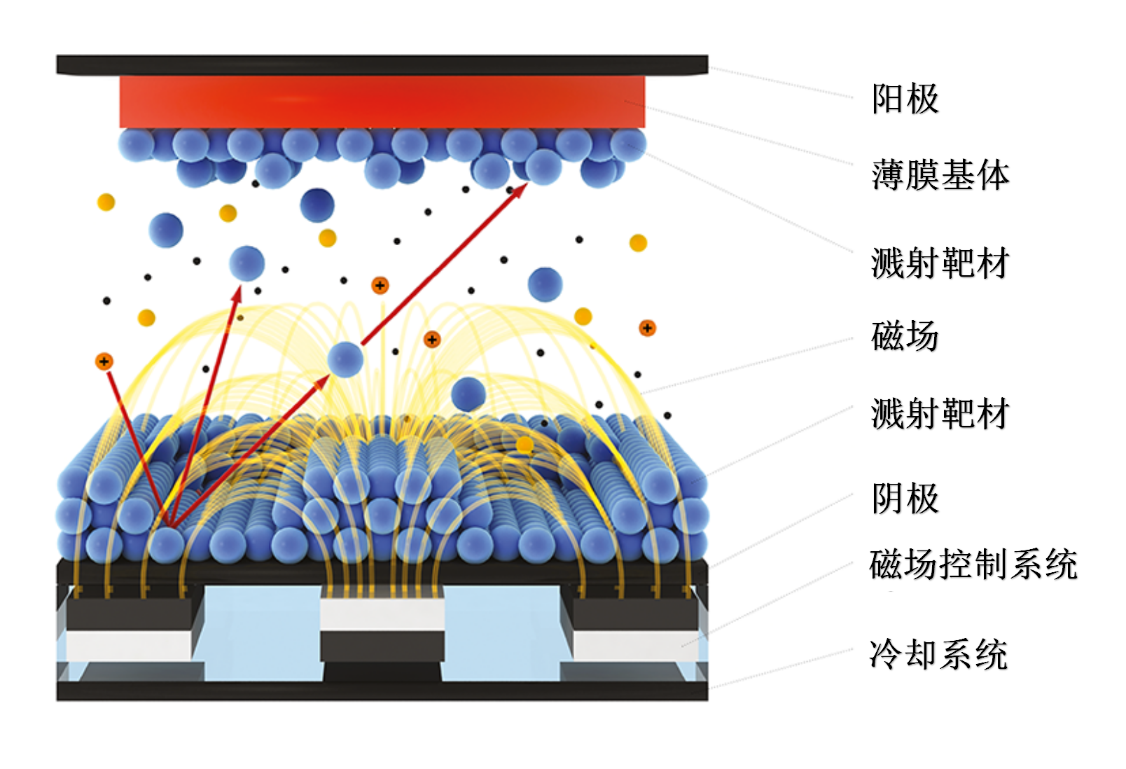 磁控濺射屬于輝光放電范疇,利用陰極濺射原理進(jìn)行鍍膜。膜層粒子來(lái)源于輝光放電中,氬離子對(duì)陰極ITO靶材產(chǎn)生的陰極濺射作用。氬離子將靶材原子濺射下來(lái)后,沉積到襯底表面形成所需ITO膜層。