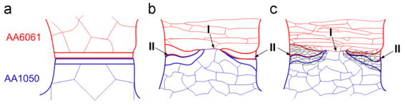 而su[2]等學(xué)者研究發(fā)現(xiàn)退火處理后的AA1050/AA6061板材經(jīng)過(guò)累積軋制的超細(xì)晶多層復(fù)合材料在不同道次下界面會(huì)呈現(xiàn)不同特征,初始三個(gè)道次內(nèi),不同鋁合金母材基本上能夠同步協(xié)調(diào)變形,但是當(dāng)軋制次數(shù)變多時(shí),AA6061界面就會(huì)發(fā)生頸縮,斷裂,最終發(fā)生界面紊亂。